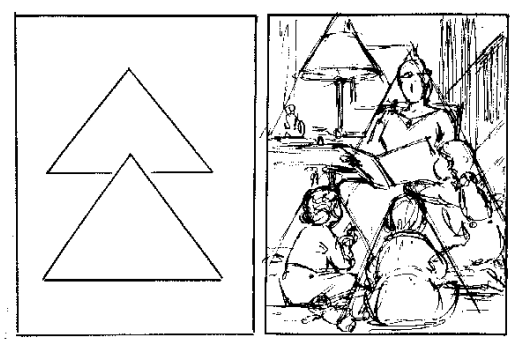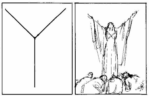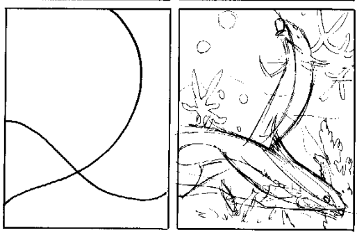 左图由两条线组成,右图用两条鱼(应该是鱼吧!)的动作与游动方向与这两条线重合,形成一种动态线来简单传达内在美。显然如果直接看右图,也很容易找到这种隐藏的线。