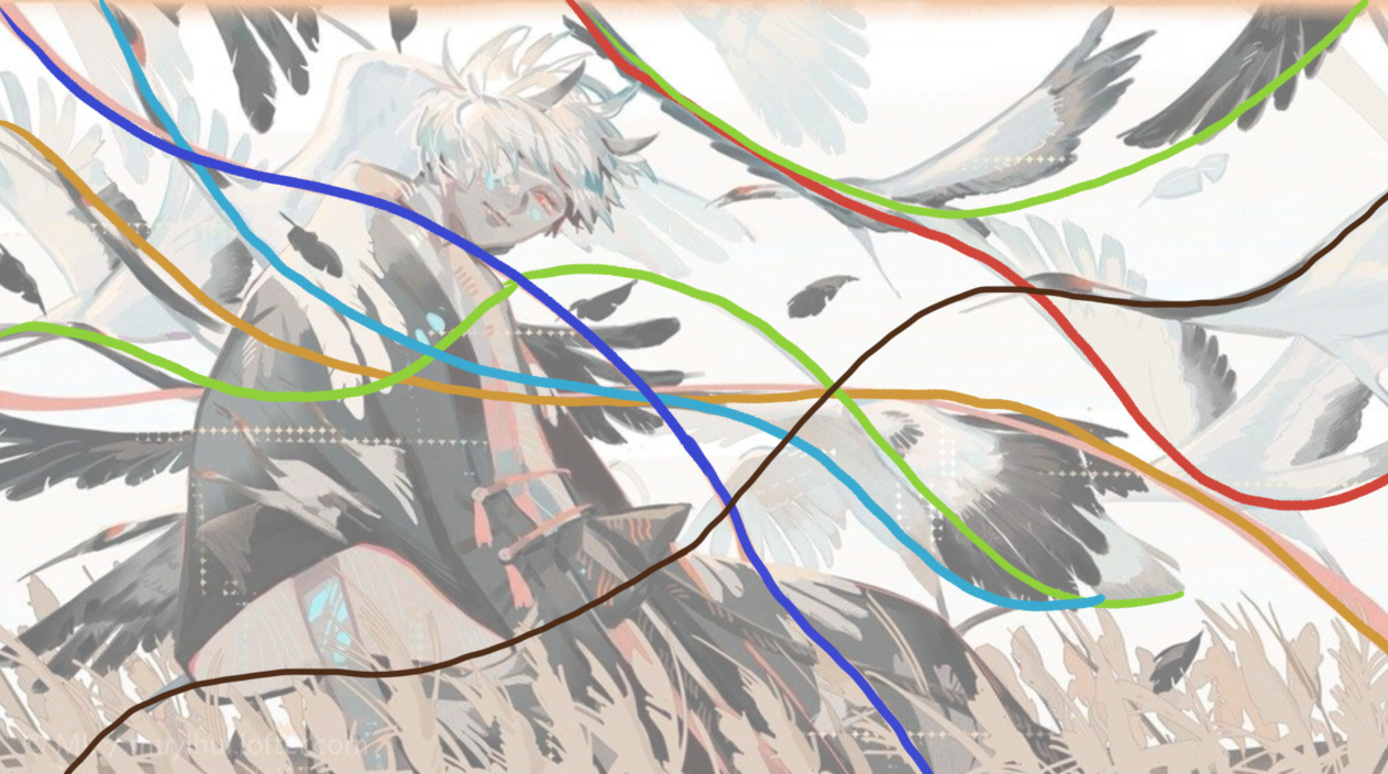 图一当中,并没有出现明显的动态线,但是依旧能够让读者的眼睛聚焦到兔子身上。图二是线的分析,可以看到这里的线,由角色的动作与形态形成。可以说是线条流畅的趋势与画面图形连接起来了,同时这也是隐藏动态线的视觉引导表现。